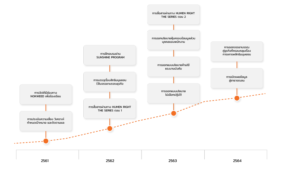 KEX ประกาศใช้นโยบายทางด้านสิทธิมนุษยชน รวมถึงนโยบายย่อย ในปี 2563 ตลอดระยะเวลา 3 ปี ที่ผ่านมา การประเมินความเสี่ยงและการอบรมภาคบังคับของบริษัท ได้รวมถึงประเด็นทางด้านสิทธิมนุษยชนเข้าไปด้วย โดยจากการสื่อสารอย่างต่อเนื่องกับพนักงานทุกระดับ ทำให้ KEX ประสบความสำเร็จในการลดจำนวนเรื่องร้องเรียนที่เกี่ยวข้องกับประเด็นทางด้านสิทธิมนุษยชน
