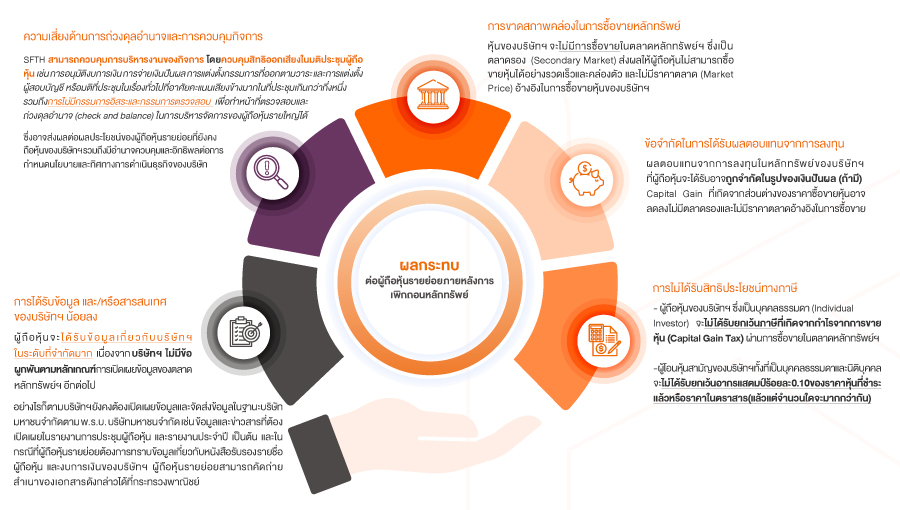 - นอกจากนี้ปัจจุบันบริษัทฯ มีการกระจายการถือหุ้นโดยผู้ถือหุ้นรายย่อย (free float) ต่ำกว่าเกณฑ์ขั้นต่ำ และเนื่องจากแนวโน้มธุรกิจ ที่ยังคงมีความท้าทาย จึงเป็นเรื่องยากที่จะเพิ่มการกระจายการถือหุ้น โดยผู้ถือหุ้นรายย่อย (free float) ผ่านการออกหุ้นใหม่ให้กับนักลงทุนทั่วไป