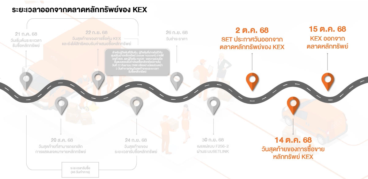 ระยะเวลาทำคำเสนอซื้อสำหรับหุ้นที่เหลือของ KEX เริ่มระหว่างวันจันทร์ที่ 21 กรกฎาคม 2568 ถึงวันพุธที่ 24 กันยายน 2568 (รวมทั้งสิ้น 45 วันทำการ) ตั้งแต่เวลา 9:00 น. ถึง 16:00 น.